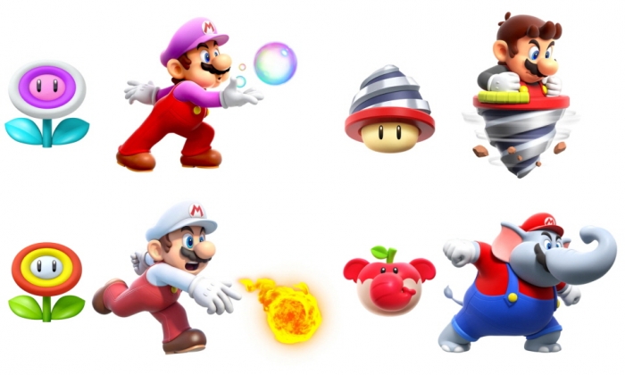 기존 시리즈와 달리 이 게임에서는 창의적인 신규 파워업과 ‘배지(Badge)’ 시스템이 조합되어 다양한 전략적 플레이가 가능해졌다. 주요 파워업 아이템으로는 엘리펀트 마리오, 버블 마리오, 드릴 마리오가 있다. 엘리펀트 마리오는 덩치가 커지고, 물을 뿜어내 장애물 제거가 가능하며 벽돌 깨기에 특화되어 있다. 버블 마리오는 적을 버블로 가둬 처치하고, 버블 위로 점프하여 새로운 길을 개척할 수 있다. 드릴 마리오는 땅속이나 천장으로 파고 들어가는 특수 능력을 가지며, 은신이나 탐험에 효과적이다. 배지 시스템은 능력을 부여하는 도구로, 액션 배지(공중 활공, 벽 점프 등), 부스트 배지(코인 보너스 등), 자동 배지(초보자용 자동 기능)를 선택할 수 있다. 레벨마다 배지를 자유롭게 바꿀 수 있기 때문에, 퍼즐과 액션을 상황에 맞게 유연하게 풀어나갈 수 있는 전략성이 생긴다.