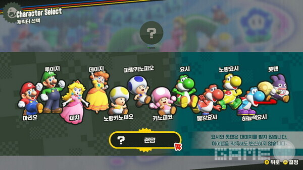 총 12명의 플레이어블 캐릭터는 다양한 취향과 난이도에 맞춰 구성되어 있다. 표준 캐릭터로는 마리오, 루이지, 피치, 데이지, 키노피오(빨강, 파랑)가 있고, 초보자용 캐릭터로는 요시 4종(초록, 빨강, 파랑, 노랑)과 키노피오가 있다. 요시는 피해를 입지 않기 때문에 초보자와 어린이에게 이상적이며, 다른 캐릭터를 업고 플레이할 수 있어 협력의 재미도 함께 선사한다. 또한 모든 캐릭터가 동일한 속도와 점프력을 가지고 있어, 선택에 따른 밸런스 불균형이 없다. 이는 정교한 레벨 디자인과 완벽한 밸런스를 기반으로 구성된 게임 설계의 결과이다.