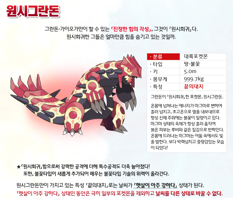 - 원시그란돈: 땅/불 타입, 특성 "끝의 대지"